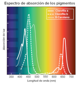 - Clorofila B: También de color verde, ayuda a la clorofila A en la absorción de luz y se encuentra en algas y árboles.